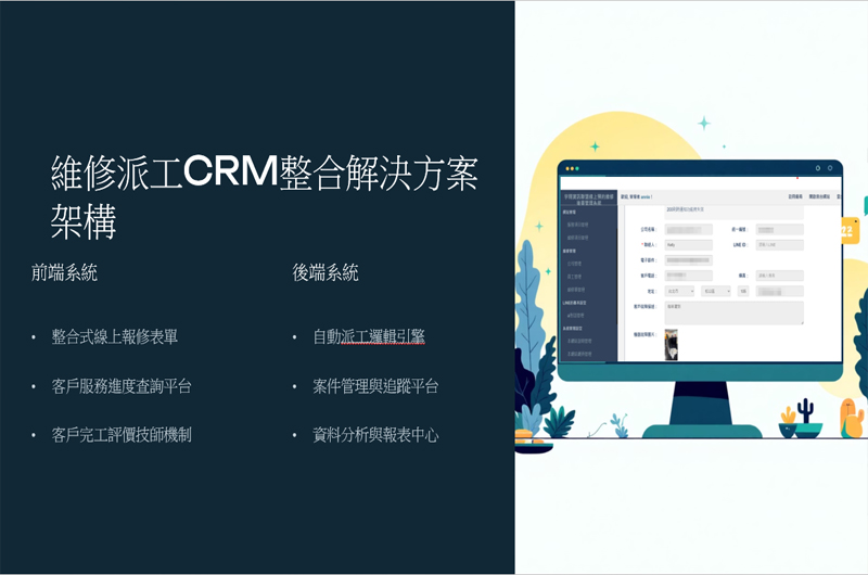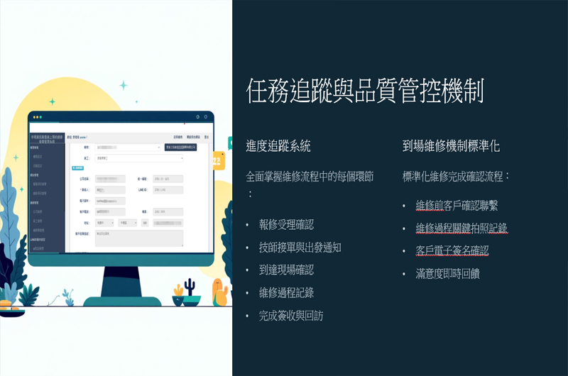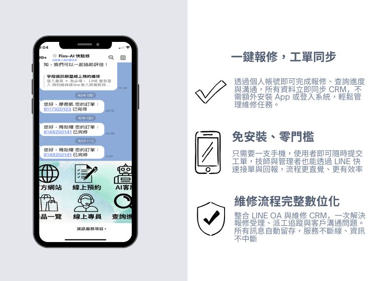 宇翔資訊聯盟是一個由全台維修工程師與行銷專家共同組成的互聯網維修平台團隊,致力於推動傳統維修產業的數位轉型。這些合作聯盟店家不僅導入雲端服務與AI技術,更全面使用宇翔資訊開發的 CRM 維修管理系統與智慧客服機器人,實現自動派工、客戶追蹤與即時回應。